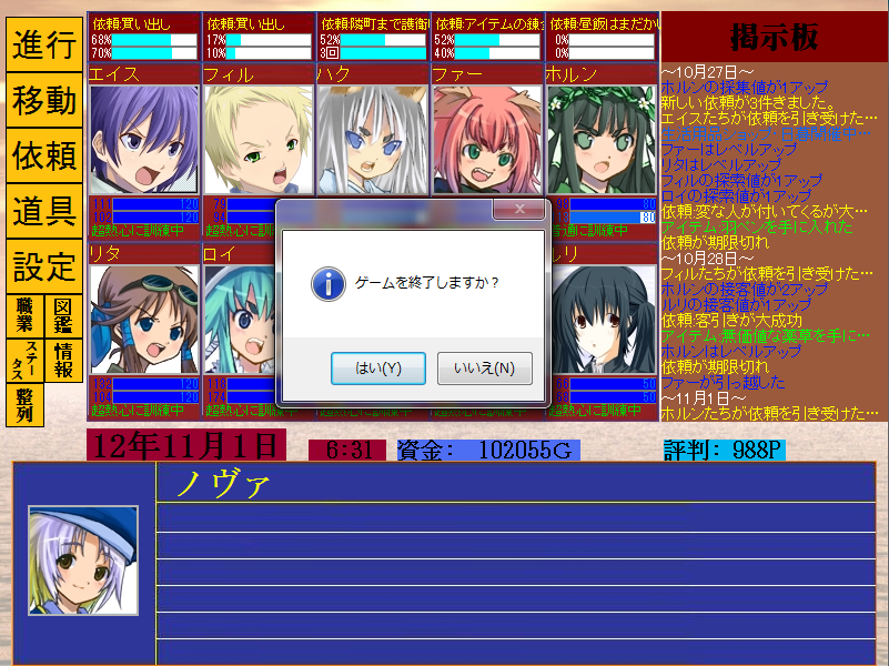 ギルマスでは、画面右上の×を押すとそのままゲームが終了していましたが、×ボタンを押すと、終了確認のメッセージが表示されるようにしました。