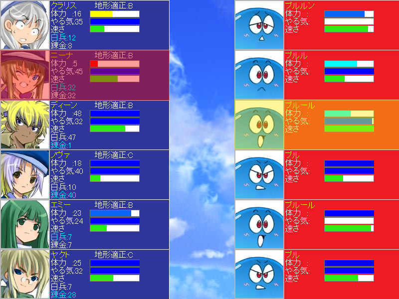 なお、この戦闘画面はキャラクターのHPとやる気というパラメータにあわせて、キャラの画像が変化します。