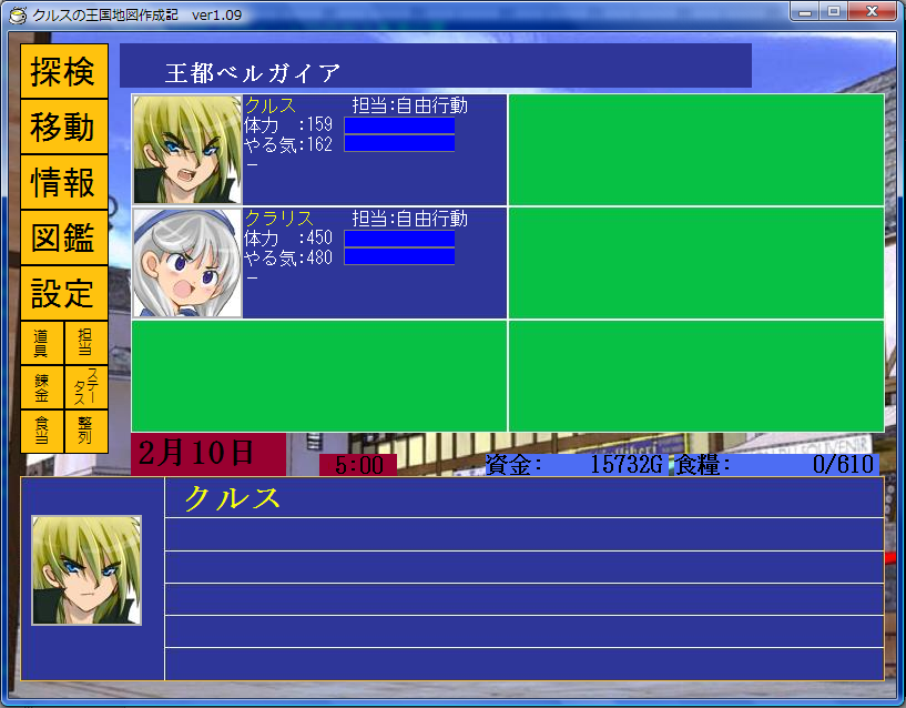以前の修正で、『クラリスの王国地図作成記』では、主役が変わったときに、タイトルバーの表示も変わるように変更しておきました。 今回の画面のタイトルバー(一番上の部分)にご注目ください。
