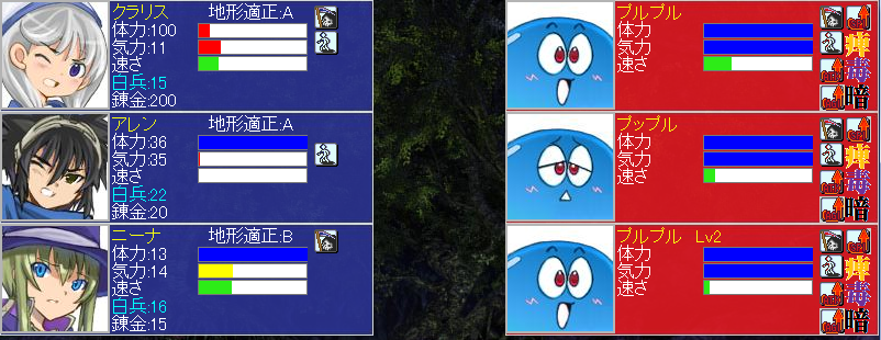 今回は戦闘システムをパワーアップということで、キャラクターに異常状態が発生するようにしています。